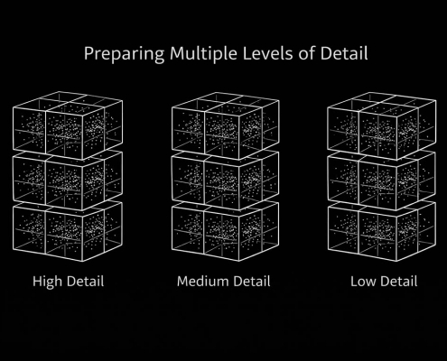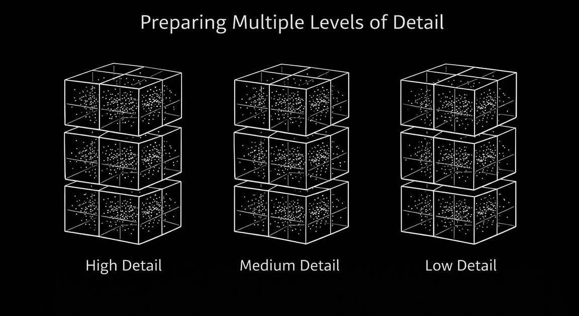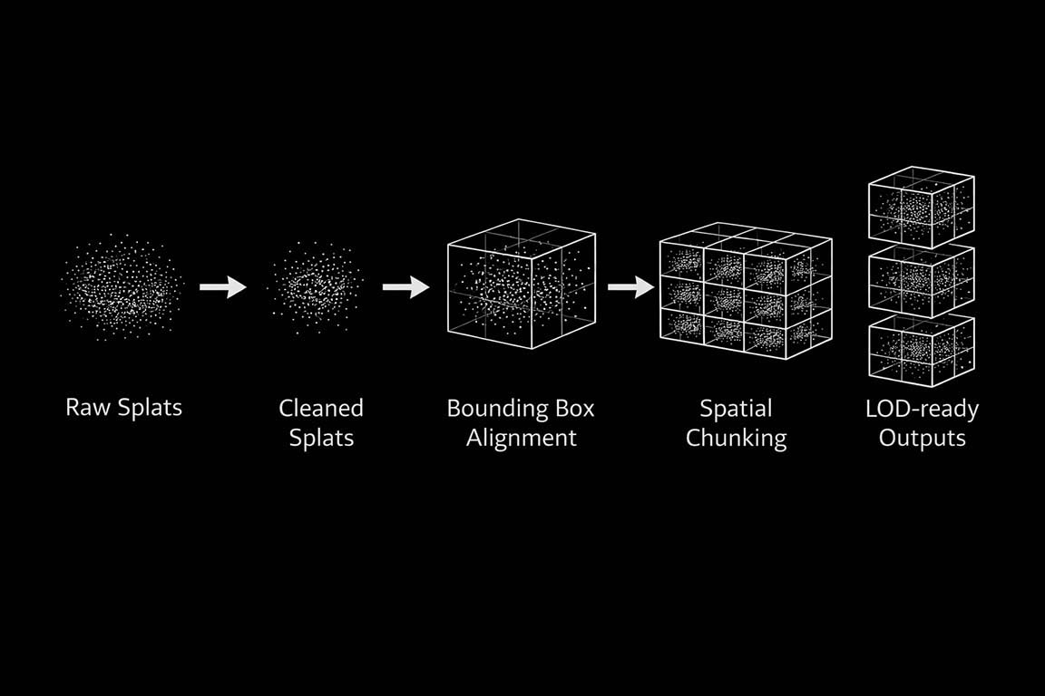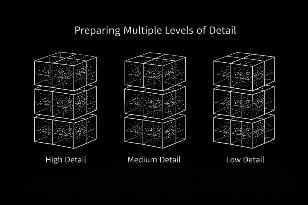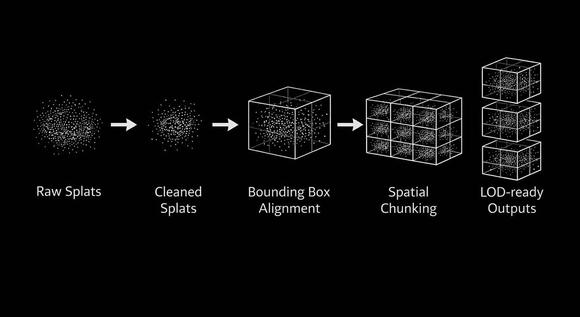 Captured splat data is first processed to remove outliers and unstable points, improving visual consistency and runtime performance. Each level of detail provided by the capture process is then spatially aligned and divided into a volumetric grid, allowing the data to be handled in smaller, independent regions rather than as a single dataset.