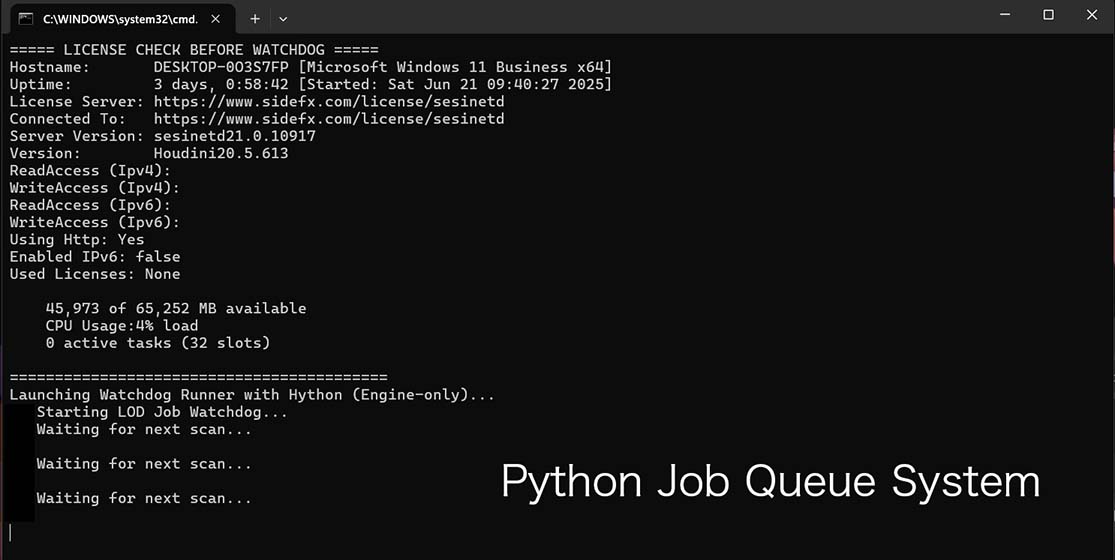 A watchdog service monitors the queue for new jobs, manages execution order, and launches headless Houdini runs. Each job file is consumed by the pipeline to drive procedural processing inside Houdini, feeding the necessary inputs into the asset preparation workflow without manual intervention.