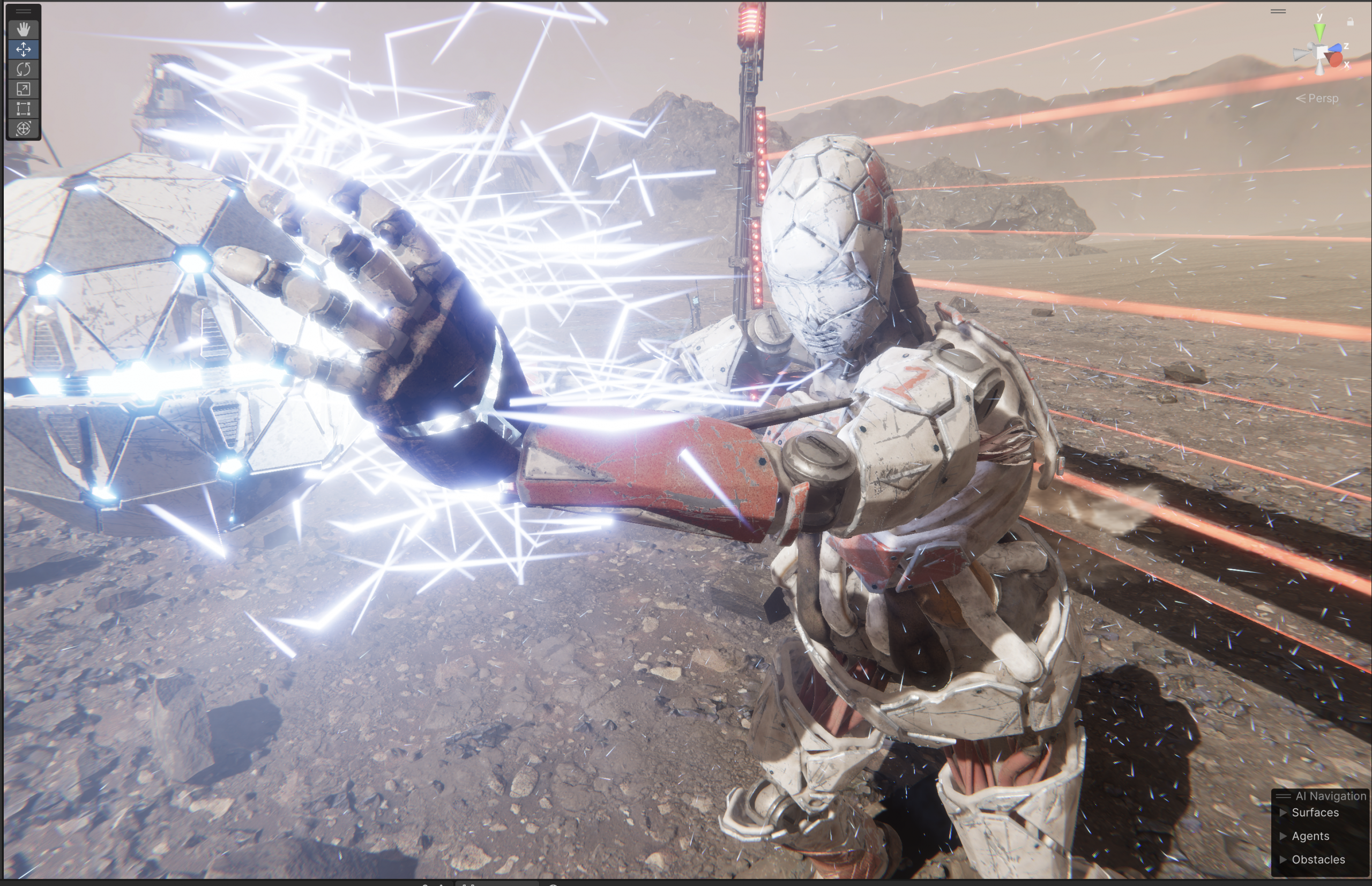 A stylized electric shader drives the look of the fence system, using animated textures and glow effects to simulate flowing energy, with runtime control over color and intensity.