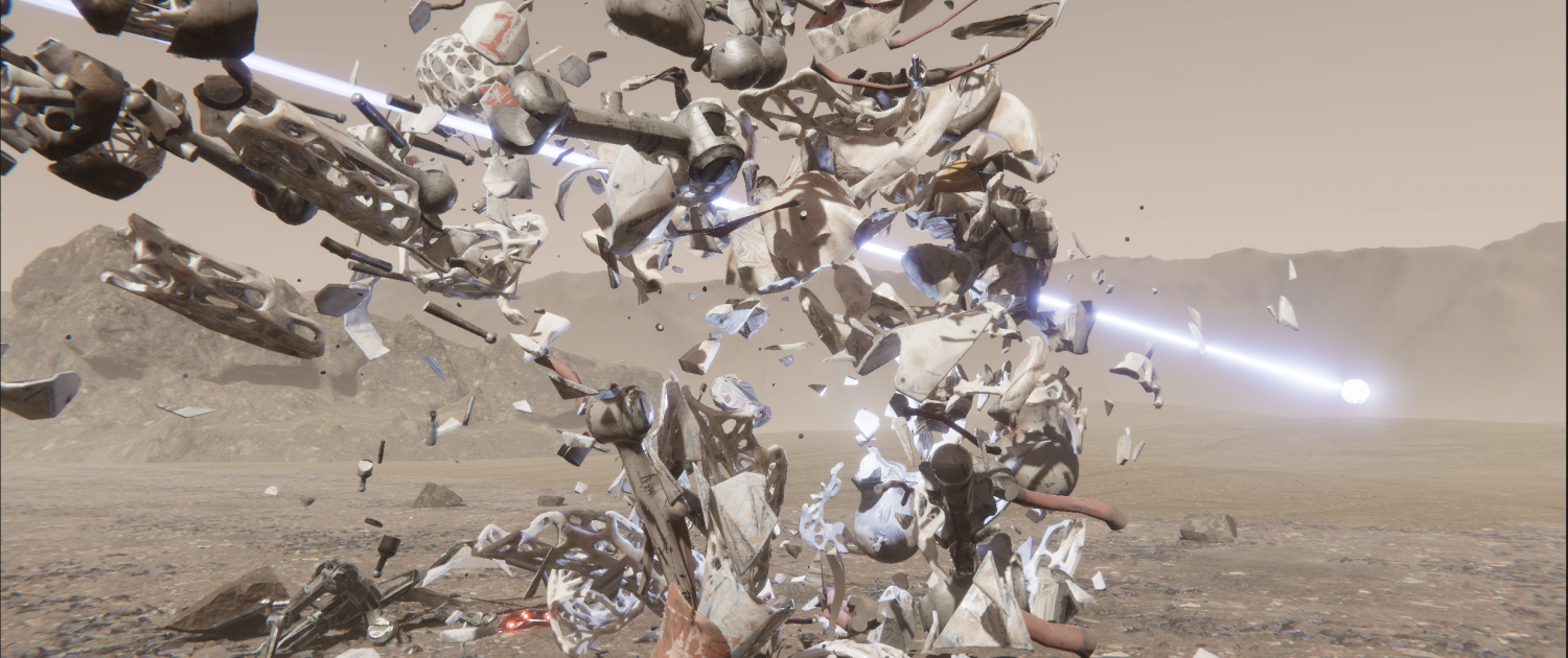 A hybrid destruction effect that visualizes a goalkeeper breaking apart on impact, with sand deformation and debris.
