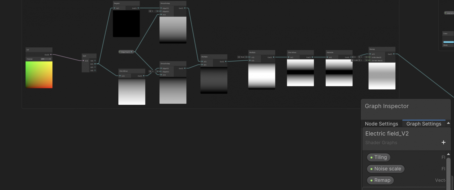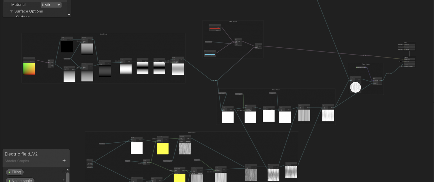 A Shader Graph setup that drives the electric flow for a destructible fence system.