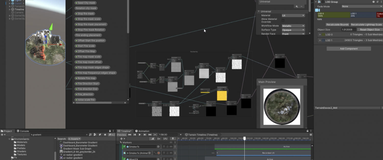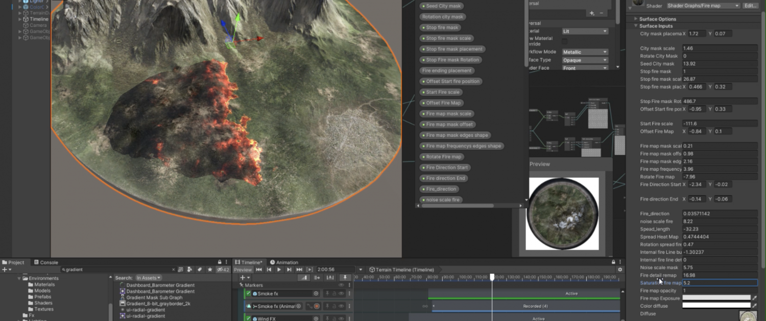 A layered wildfire effect combining procedural shaders and GPU-driven wind to create an aggressive fire spread.